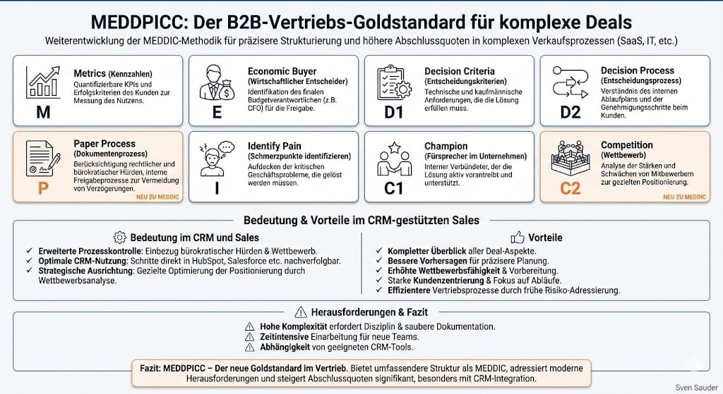 Während MEDDIC bereits eine solide Grundlage bietet, geht MEDDPICC einen Schritt weiter, indem es die Bedeutung von rechtlichen und bürokratischen Hürden sowie die Analyse der Wettbewerbslandschaft einbezieht.
